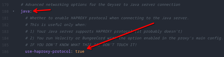 You’ll also need to set use-haproxy-protocol to true again in the Bedrock section, and change haproxy-protocol-whitelisted-ips: [] to ["10.10.1.0/24"]